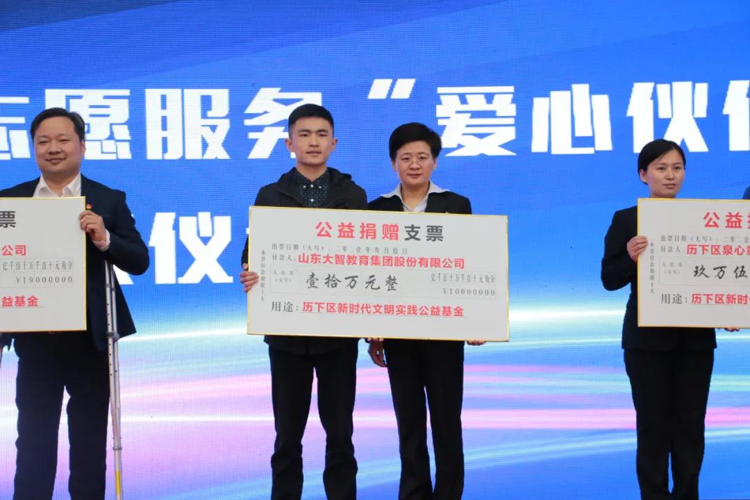 愛(ài)心伙伴項(xiàng)目捐助認(rèn)領(lǐng)儀式上,山東大智教育集團(tuán)股份有限公司等五組愛(ài)心伙伴企業(yè)負(fù)責(zé)人為志愿服務(wù)團(tuán)隊(duì)代表進(jìn)行捐贈(zèng)。其中大智教育集團(tuán)為歷下區(qū)新時(shí)代文明實(shí)踐公益基金捐贈(zèng)10萬(wàn)元。
