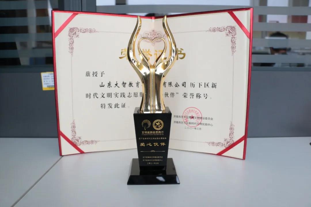 濟(jì)南市歷下區(qū)精神建設(shè)委員會(huì)和濟(jì)南市歷下區(qū)新時(shí)代文明實(shí)踐中心授予山東大智教育集團(tuán)有限公司歷下區(qū)新時(shí)代文明實(shí)踐志愿服務(wù)“愛(ài)心伙伴”稱(chēng)號(hào),并授予了榮譽(yù)獎(jiǎng)杯及證書(shū)。