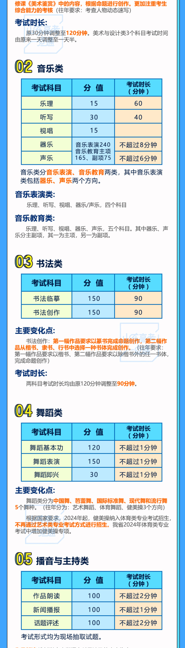 另外健美操項(xiàng)目調(diào)整至體育類專業(yè)招生。根據(jù)教育部有關(guān)要求,2024年起,我省將健美操納入體育專業(yè)測(cè)試。健美操專項(xiàng)考生的體育專業(yè)測(cè)試成績(jī)由基本素質(zhì)測(cè)試成績(jī)(包括100米跑、原地推鉛球、立定跳遠(yuǎn)等3項(xiàng)測(cè)試)和健美操專項(xiàng)測(cè)試成績(jī)組成。健美操專項(xiàng)測(cè)試標(biāo)準(zhǔn)動(dòng)作樣片可在山東省教育招生考試院網(wǎng)站查看