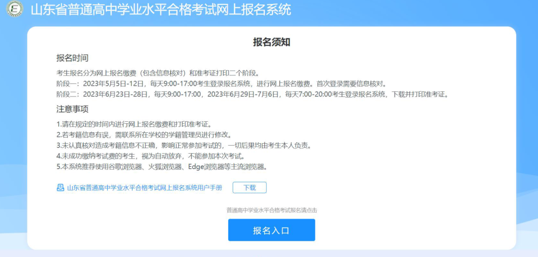 參加山東省2023年冬季普通高中學(xué)業(yè)水平合格考試(以下簡稱冬季合格考)的考生須于10月19日—26日每天9:00—17:00,登錄報(bào)名系統(tǒng)進(jìn)行信息核對,信息核對無誤后直接進(jìn)行網(wǎng)上選科繳費(fèi)。繳費(fèi)成功方視為報(bào)名完成,否則視為未報(bào)名成功,不能參加本次考試。