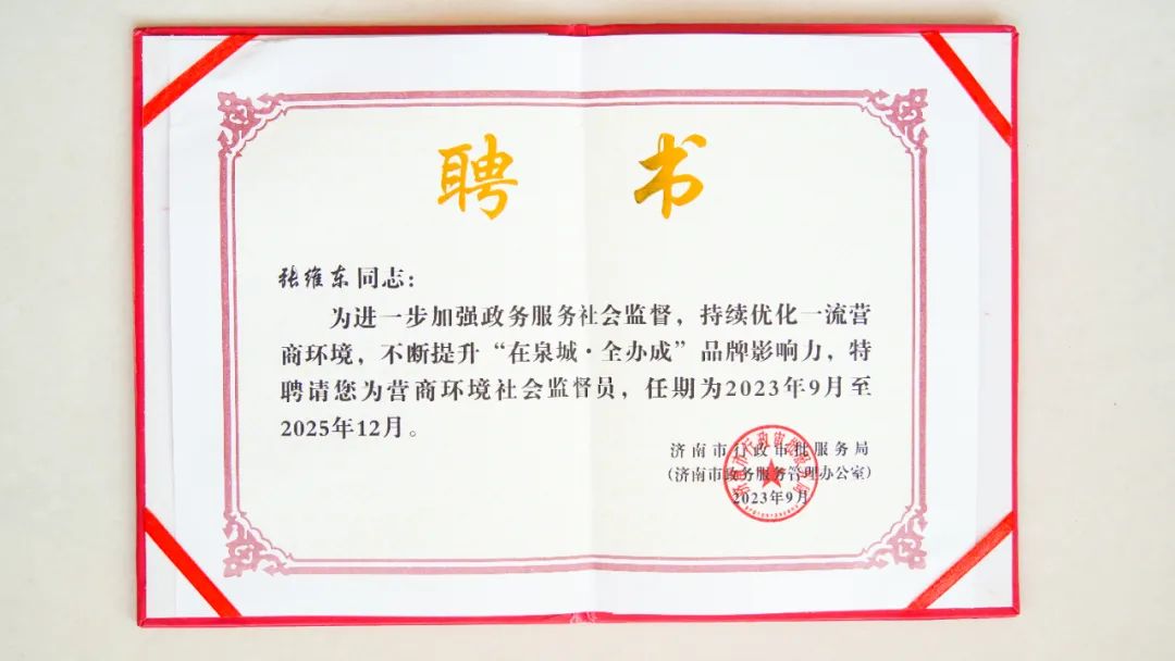 為進一步加強政務服務、社會監(jiān)督,持續(xù)優(yōu)化一流營商環(huán)境,不斷提升“在泉城?全辦成”品牌影響力。近日,濟南市行政審批服務局特聘大智控股集團創(chuàng)始人、董事長張維東擔任營商環(huán)境社會監(jiān)督員,任期兩年。