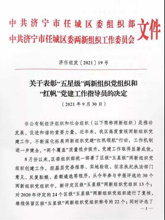 近日,中共濟寧市任城區(qū)委組織部、中共濟寧市任城區(qū)委兩新組織工作委員會發(fā)布《關(guān)于表彰“五星級”兩新組織黨組織和“紅帆”黨建工作指導(dǎo)員的決定》(濟任組發(fā)〔2021〕19號)有關(guān)規(guī)定,大智濟寧區(qū)域黨支部榮獲任城區(qū)“五星級”黨組織稱號!
