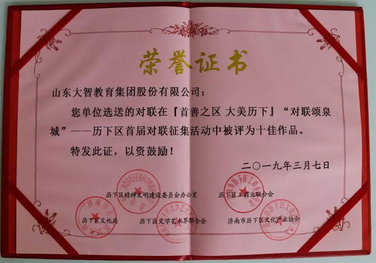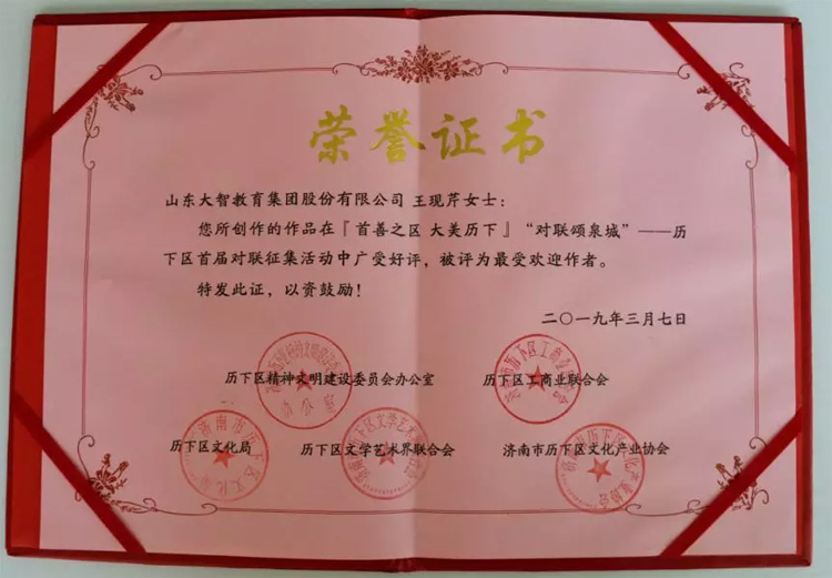 03月07日,『首善之區(qū) 大美歷下』“對聯(lián)頌泉城”——歷下區(qū)首屆對聯(lián)征集評選活動頒獎典禮在濟南市歷下區(qū)歷下大廈舉行。大智控股集團黨委書記王現(xiàn)芹作為獲獎?wù)呤苎麉⒓拥涠Y。