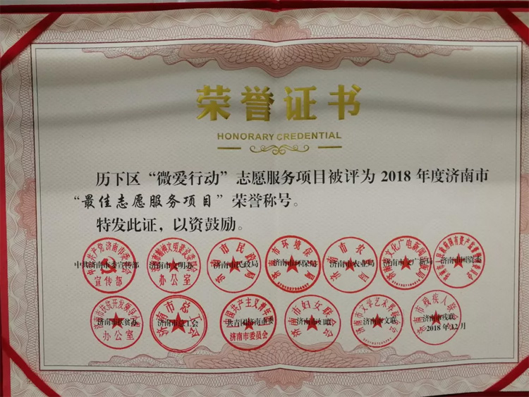 大智“微愛行動”志愿服務(wù)項目被授予“山東省2018年度最佳志愿服務(wù)項目”和“2018年度濟南市最佳志愿服務(wù)項目”榮譽稱號。