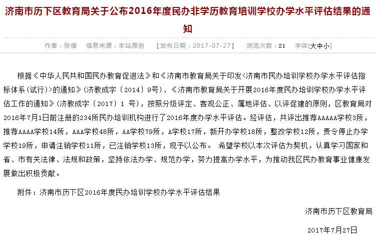 10月29日,從濟(jì)南市教育局傳來喜訊,濟(jì)南市歷下區(qū)大智培訓(xùn)學(xué)校在2016年度民辦培訓(xùn)學(xué)校辦學(xué)水平評估中,被評為 “AAAAA學(xué)校”,根據(jù)《濟(jì)...