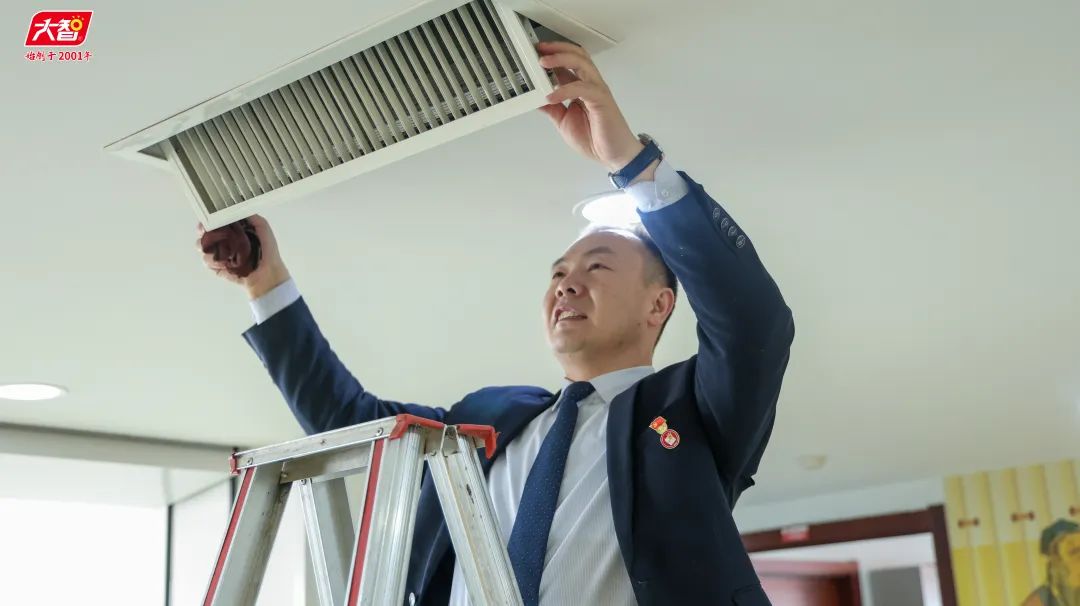 大智黨員爬高登梯,認真完成濾網(wǎng)拆卸、灰塵擦拭、集中清洗、安裝復位等環(huán)節(jié),以“紅色力量”守護大智家人健康,助力集團節(jié)能增效。