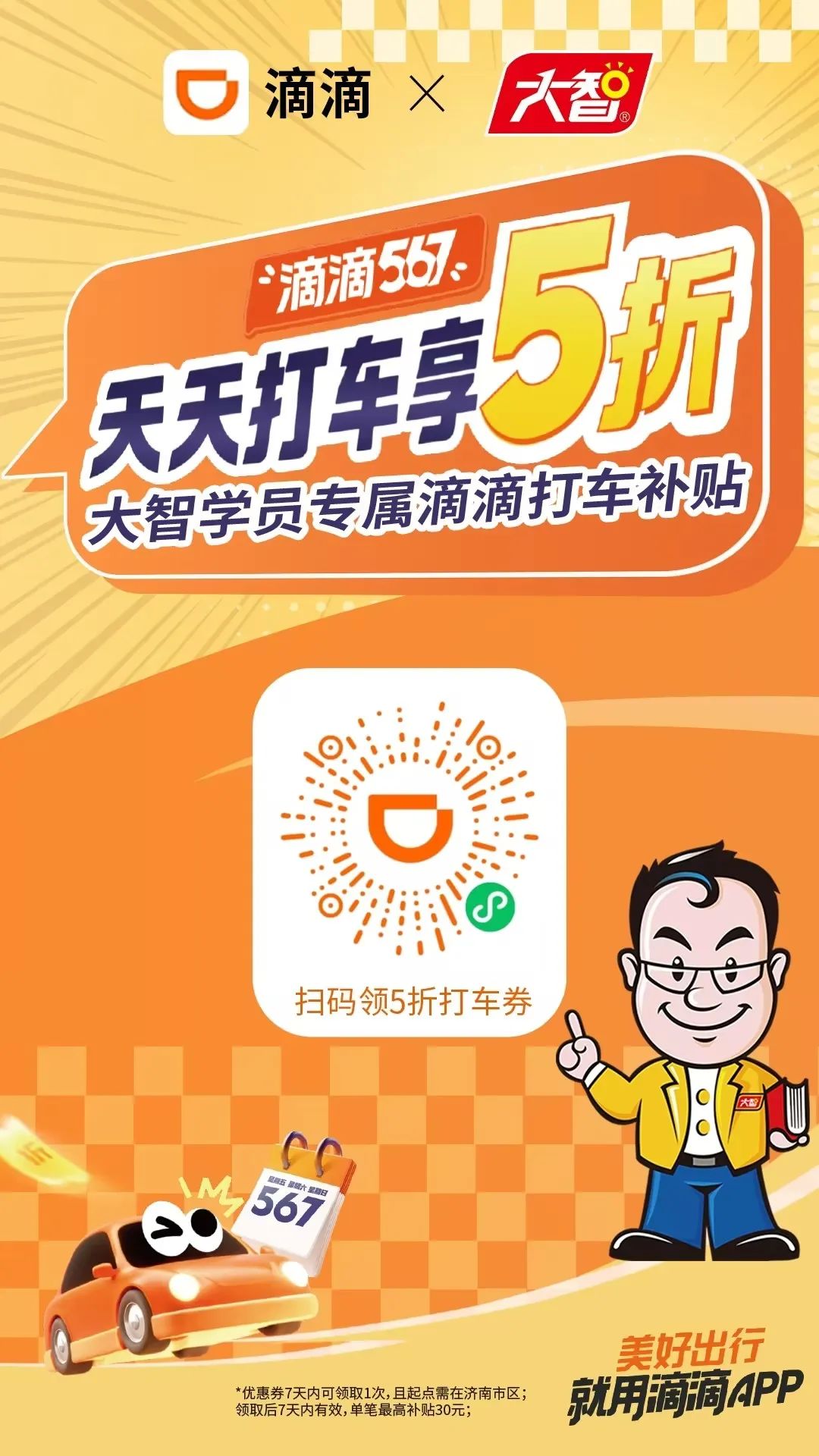 家人們,福利來嘍~這是大智和滴滴合作的“大智學(xué)員定制折扣券”有需要的同學(xué)和家長(zhǎng)朋友們可以領(lǐng)一下掃碼領(lǐng)取注:①里面有2張5折券(最多可減30元...