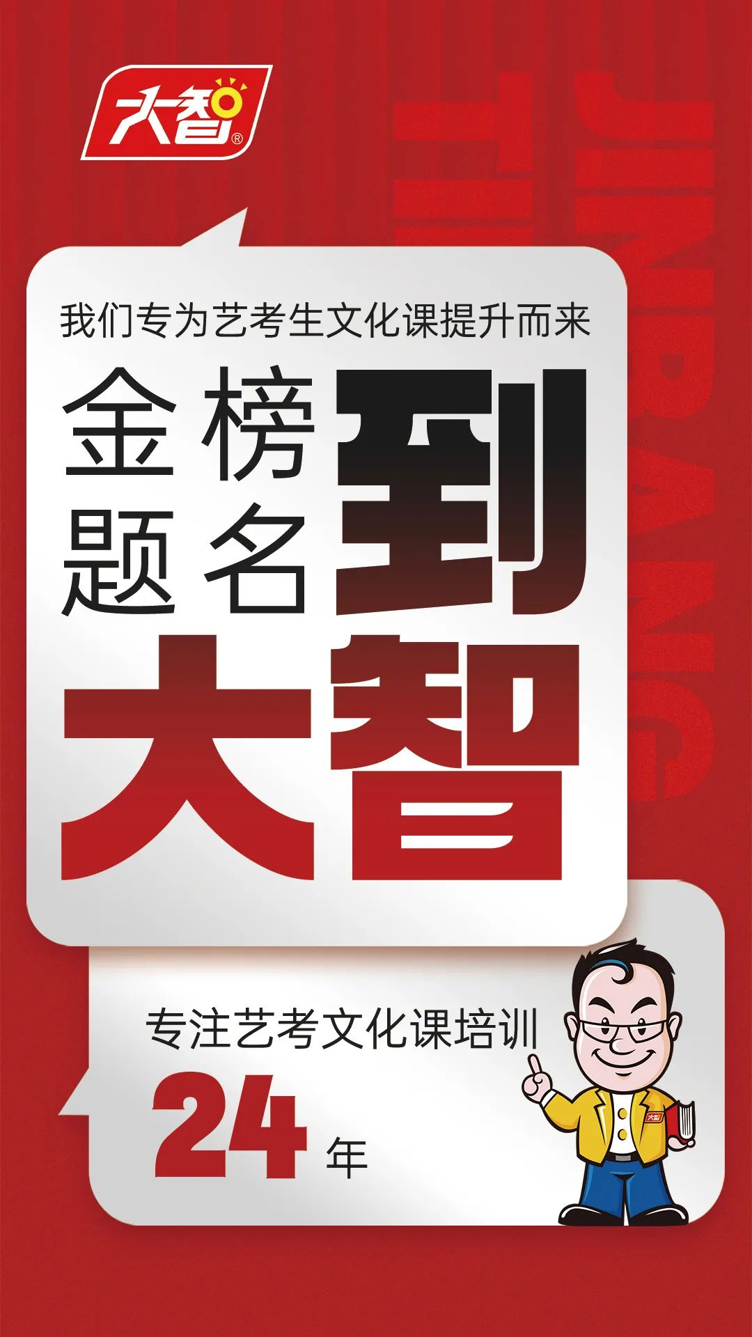 夢(mèng)想啟航篇大智教育大智是運(yùn)營(yíng)高考文化課、藝體生文化課、升學(xué)規(guī)劃的專業(yè)性機(jī)構(gòu)。大智始終以“為黨育人 為國(guó)育才”為己任,秉承“視學(xué)生為親人 視家...