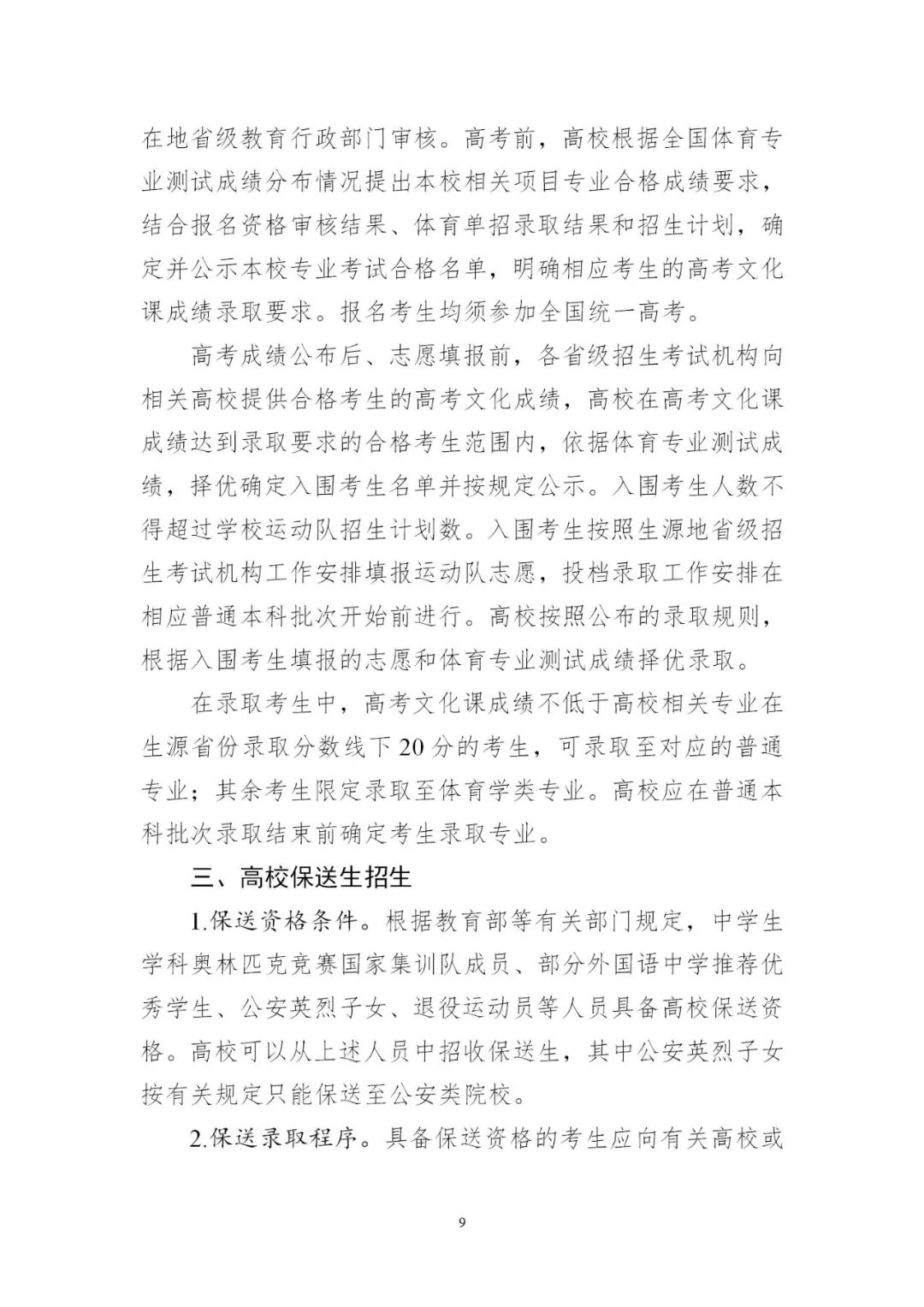 9.健全監(jiān)督制約機(jī)制。各地和有關(guān)高校要建立健全多級(jí)監(jiān)督制約機(jī)制,主動(dòng)接受紀(jì)檢監(jiān)察部門監(jiān)督檢查,推動(dòng)主體責(zé)任和監(jiān)督責(zé)任協(xié)同發(fā)力。認(rèn)真執(zhí)行高校招生信息公開制度,按工作要求及時(shí)公布有關(guān)信息,主動(dòng)接受社會(huì)監(jiān)督。未按要求公示的有關(guān)特殊類型考生一律不得錄取。暢通社會(huì)監(jiān)督舉報(bào)渠道,完善考生申訴復(fù)核機(jī)制,及時(shí)回應(yīng)處理各種問題。加強(qiáng)新生入學(xué)資格審查和專業(yè)復(fù)測(cè),對(duì)審查或復(fù)測(cè)發(fā)現(xiàn)問題的,組織專門調(diào)查并按有關(guān)規(guī)定進(jìn)行處理。