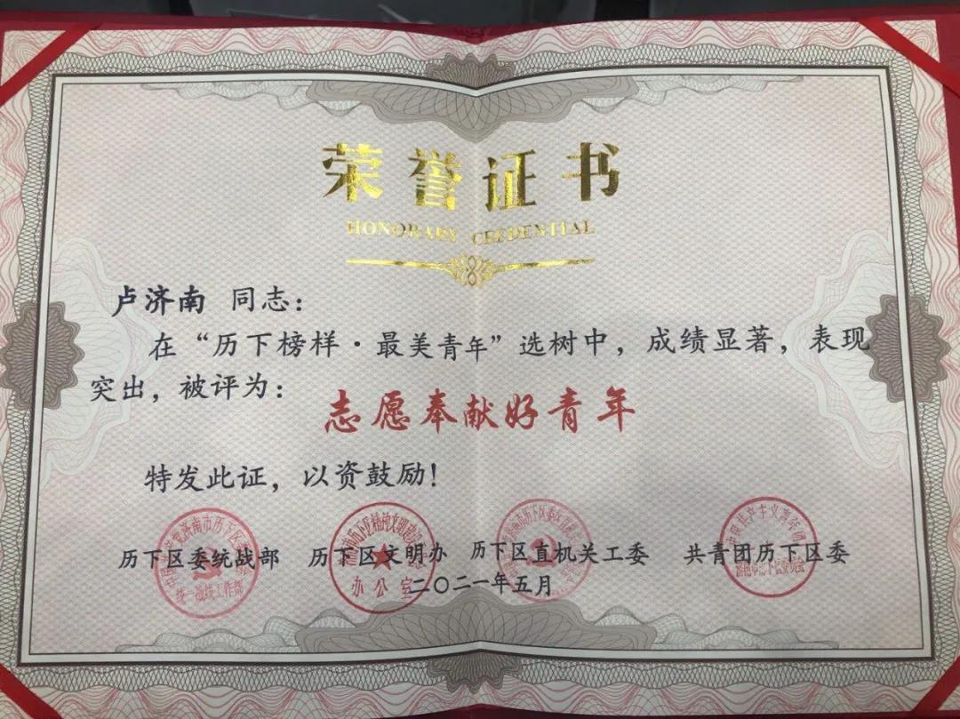 同時(shí),大智(濟(jì)南)智學(xué)智愛志愿服務(wù)隊(duì)領(lǐng)隊(duì)盧濟(jì)南榮獲“志愿奉獻(xiàn)好青年”榮譽(yù)稱號。